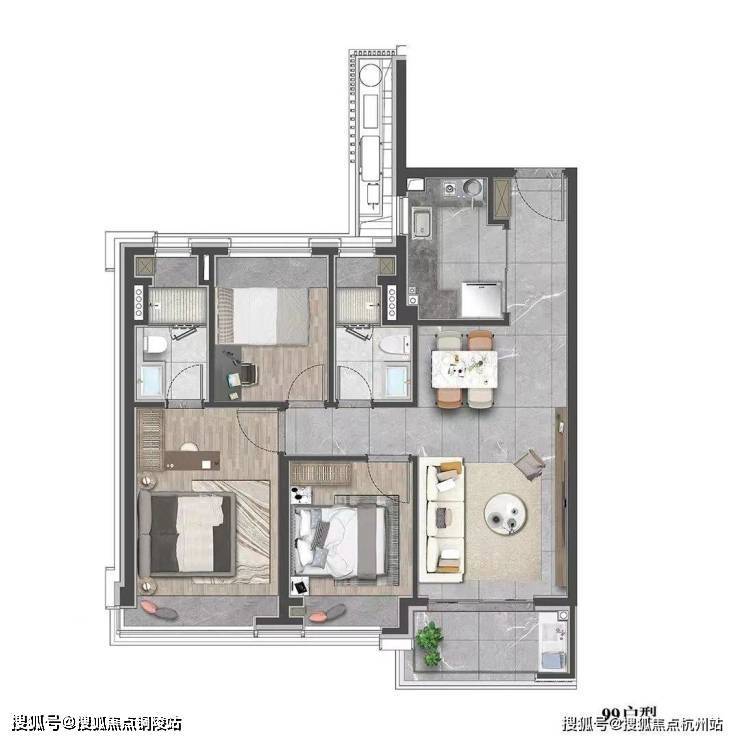 建面约99㎡的三房设计,在空间上使用功能更加多样化,一站式解决了家庭生活的所有功能,优化居家动线,大大提升空间的居住体验。