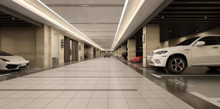 宝华的精装车库一直被模仿,从未被超越,堪称上海乃至全国教科书般标准,石材车道、镜面环氧停车位,空间宽敞、明亮、通透,据悉这一次立柱的饰面和灯带都会有所升级。