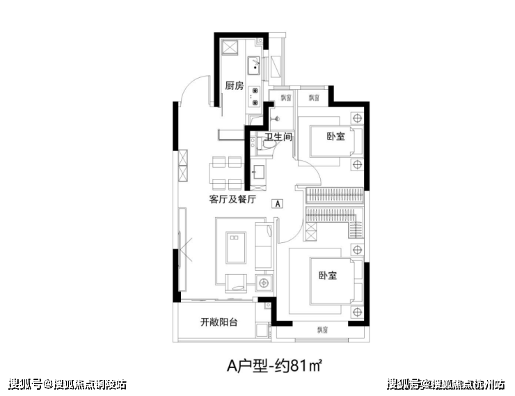 建面约81㎡2房功能齐全,拥有朝南大面宽和全卧飘窗设计。