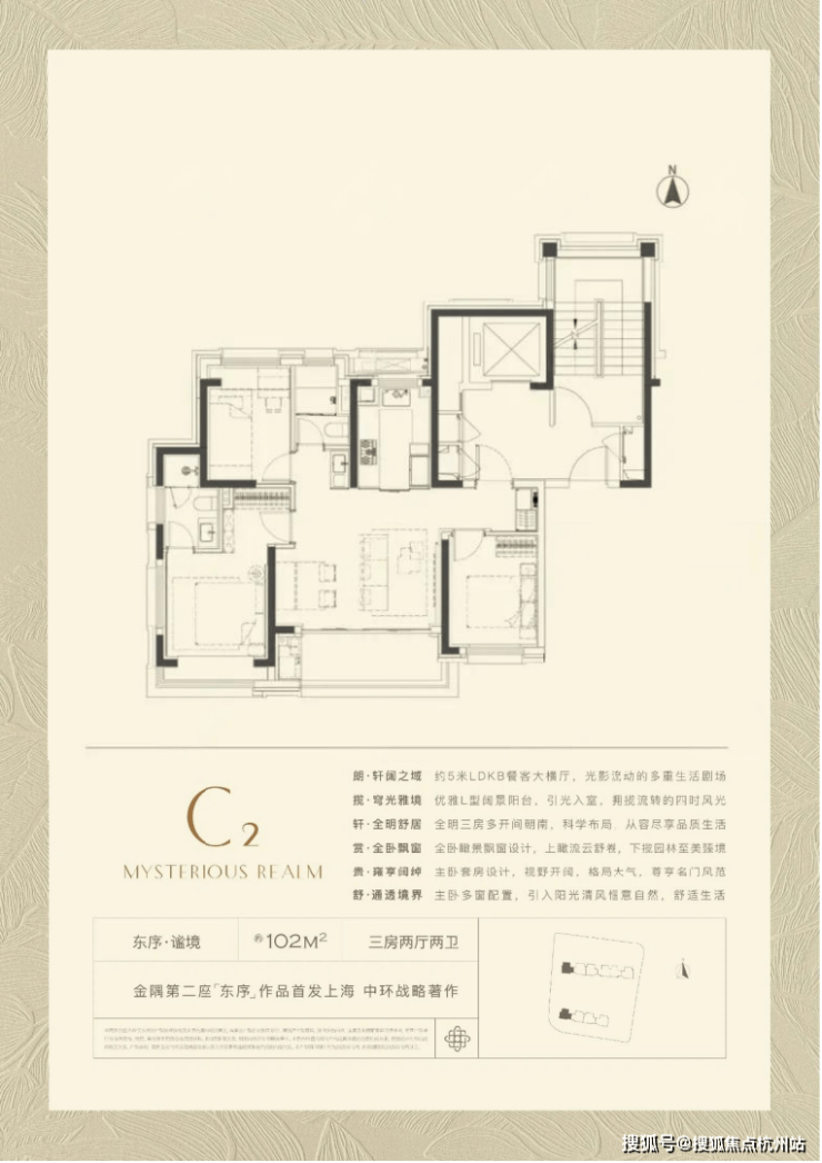 【约102㎡样板间】三房两厅两卫格局,同样的布局设计巧思应用于102㎡,打造出近乎双套房的生活体验。5米面宽横厅设计,营造极致通透感,臻选奢石融入空间,优雅时尚。厨房科学动线设计,搭配国际品牌五金和厨电,悦享精致烹饪时刻。星级主卧,独立卫浴,将空间最大程度延伸,打造舒居体验。