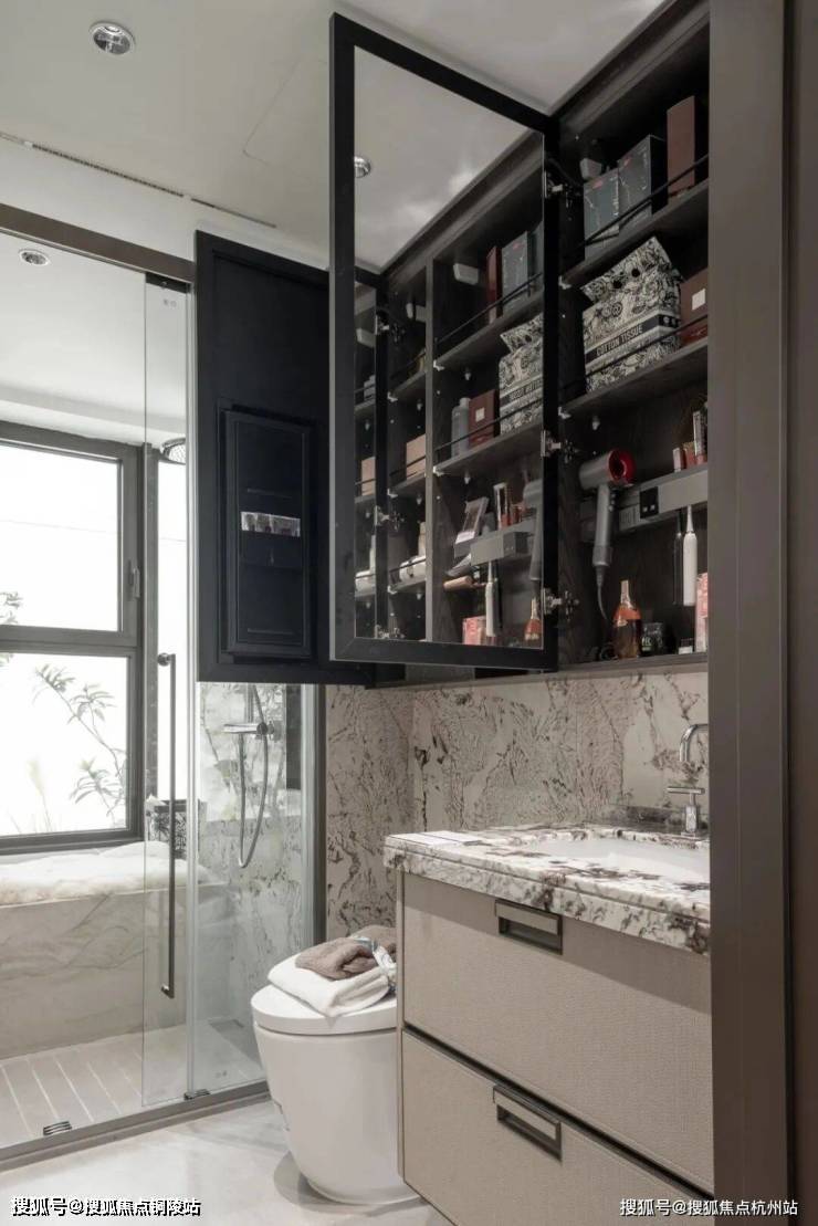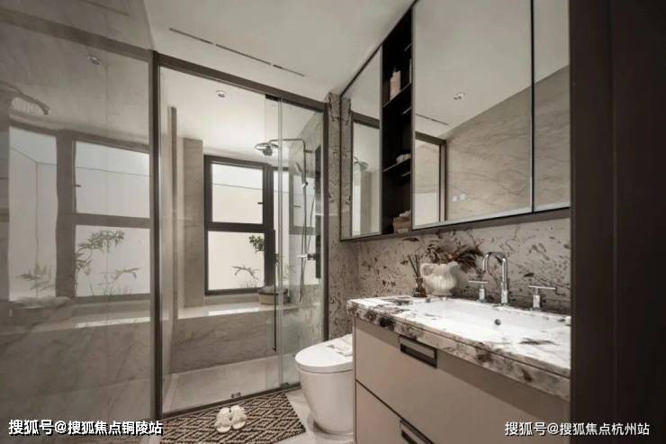 除了户型尺度,招商序的展示空间用料也是在700万这个量级难逢敌手,整个展示空间,除了卧室的拼花地板,其他区域的地面与墙面几乎全是岩板与奢石。连卫生间墙面都做到了岩板通铺....这种用料一般只有千万级的豪宅才能看到,114的客厅背景墙也采用了天然大理石搭配岩板交付,岩板因工艺复杂、性能优异,多用于高端场景,招商序厨房、卫生间墙面地面,客餐厅地面连通阳台,全部通铺岩板,可见硬装投入度之高。