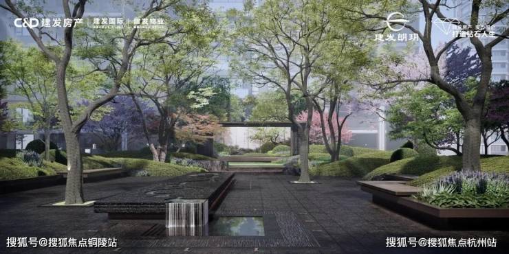 雅致石院与中庭古树相映,植物组团错落有致,营造出清逸山水园林之美,唤醒人们对林荫树下休憩闲聚的场地记忆。