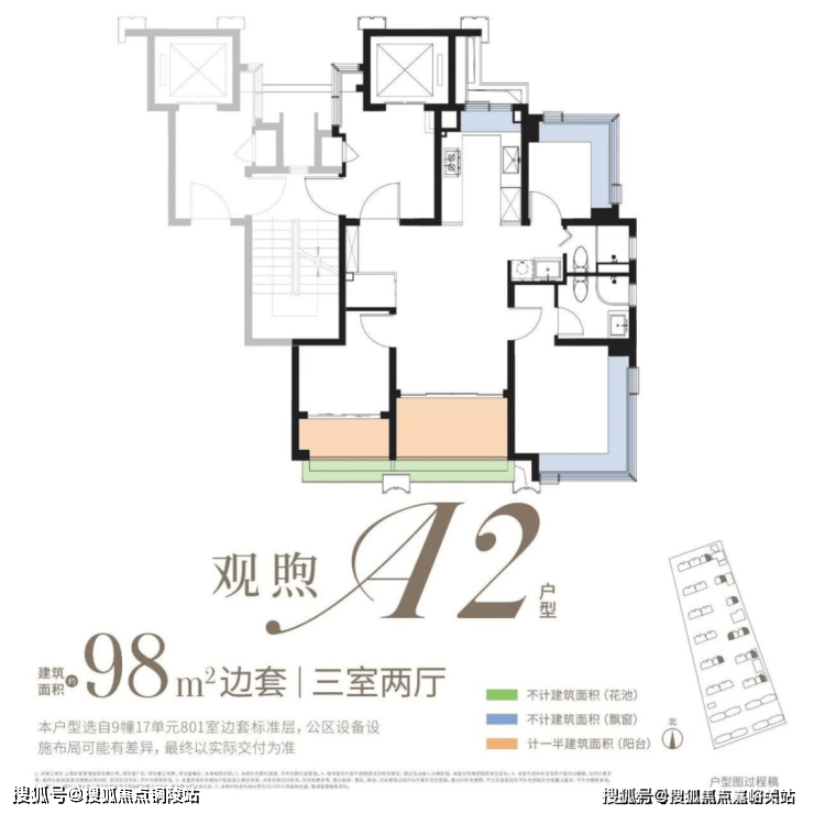 约98㎡3房:类一梯一户、全屋飘窗为标配,双阳台+景观花池是核心亮点(市面双阳台户型起步多为约110㎡),整体附赠约23㎡,是罕见的高实得率精致户型。