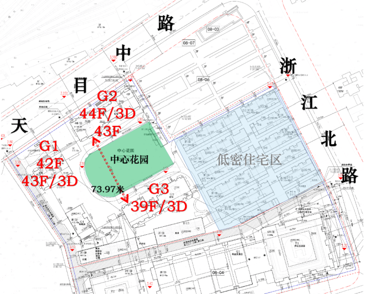 08-01地块设计了G1、G2、G3三栋超高层住宅,分别为39-44层不等;低密住宅区楼间距只有6米左右。