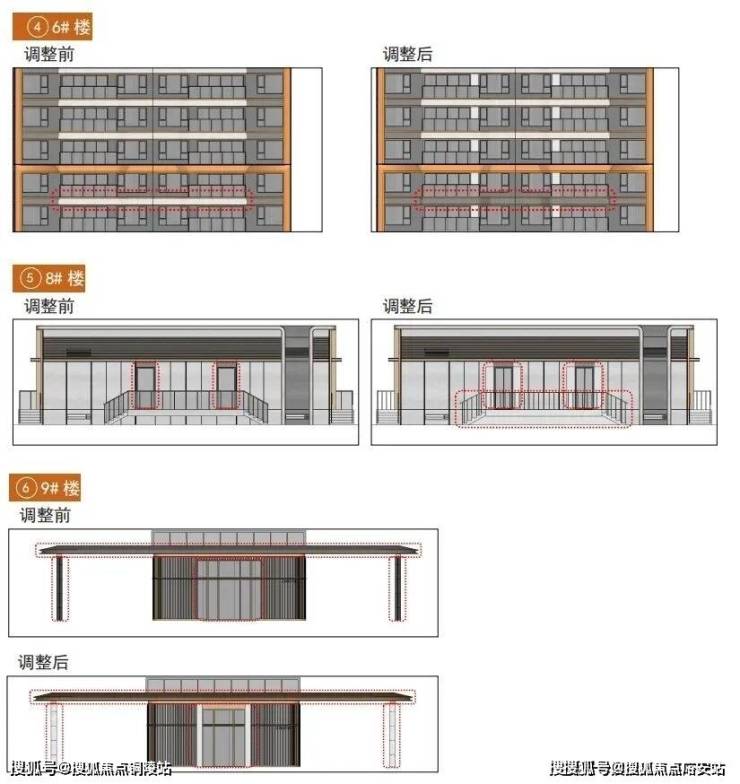 配套建筑同步升级:6#楼的 南立面调整了铝线条间的涂料颜色 ;8#配电站将台阶玻璃栏杆换为更耐久的 不锈钢栏杆 ,台阶及台阶下方浅色铝板改为 浅色仿石涂料 ,并调整外门开启角度至 180度 ,兼顾美观与实用;9#门卫兼快递收发室优化了屋面、柱子材质颜色,并根据现场深化了落地窗尺寸。