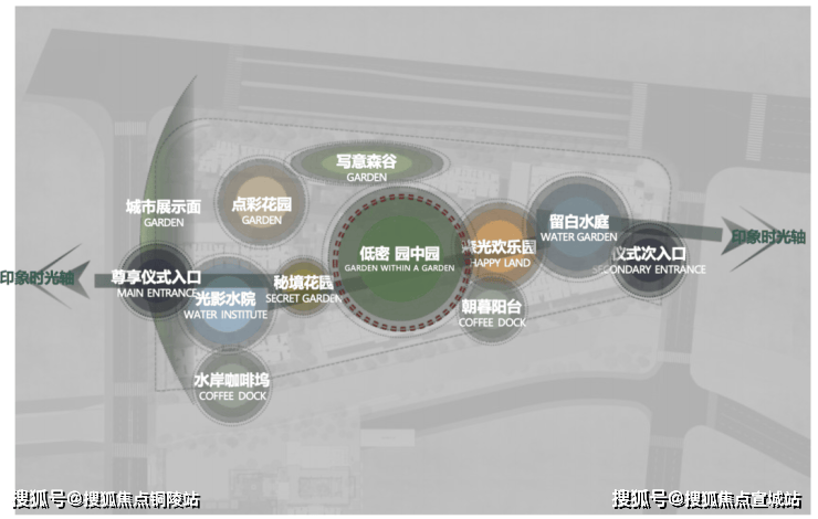 以一条尊享轴线印象时光轴将社区园林有机串联,形成步移景异的丰富空间层次。沿此轴线八大主题景点依序展开,呈现全龄段、多维度的生活场景: