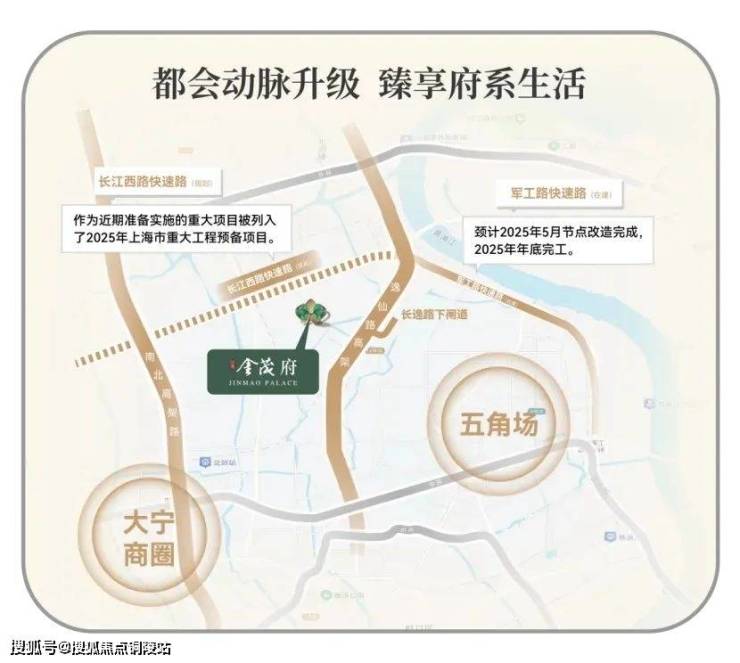 在城市交通路网方面,江湾金茂府同样优势显著。周边拥享中环高架、长江西路快速路、外环高速三横主轴,以及逸仙路高架、南北高架两纵接驳 。