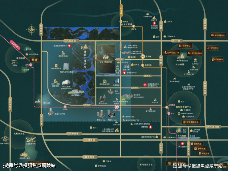 以中央绿地为轴,依托政策优势,构建功能组团,推动产业集群发展、区域规划落地,打造全新的上海市中心国际社区。
