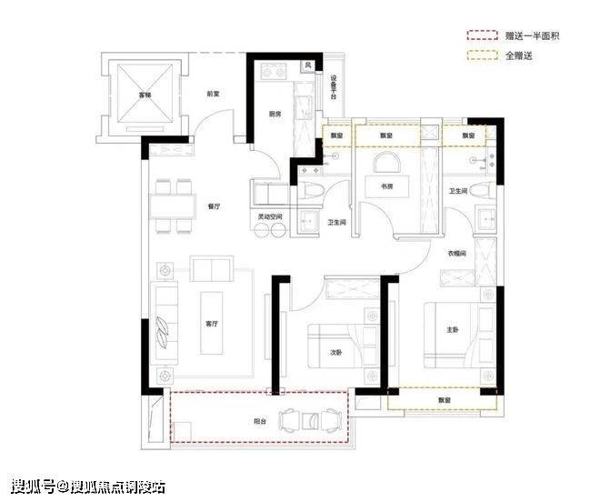 主力建面约95-96㎡的三房,是奉贤本地最受欢迎的户型——南北通透、三开间朝南、经典的飞机布局。客餐厅连通阳台,整个动区明亮通透;三个房间分置两侧,互不干扰。无论是三口之家还是与父母同住,都能保证各自的空间。
