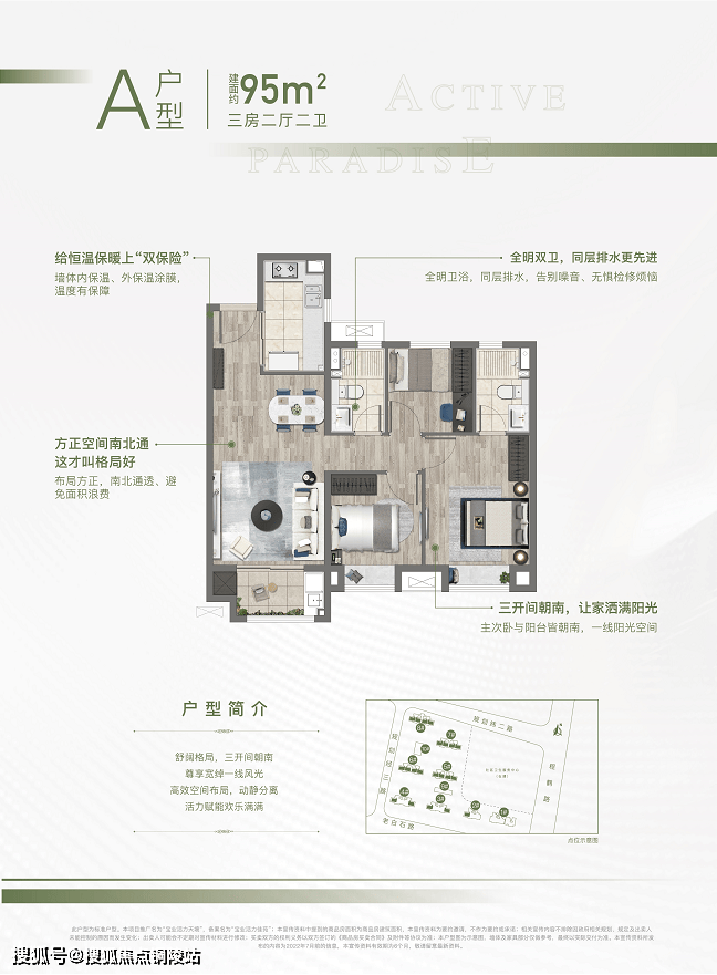 约95平三房两厅两卫,做到了三开间朝南+主卧套房设计+南北通透+动静分离+双朝南卧室带飘窗,是非常棒的3房户型!