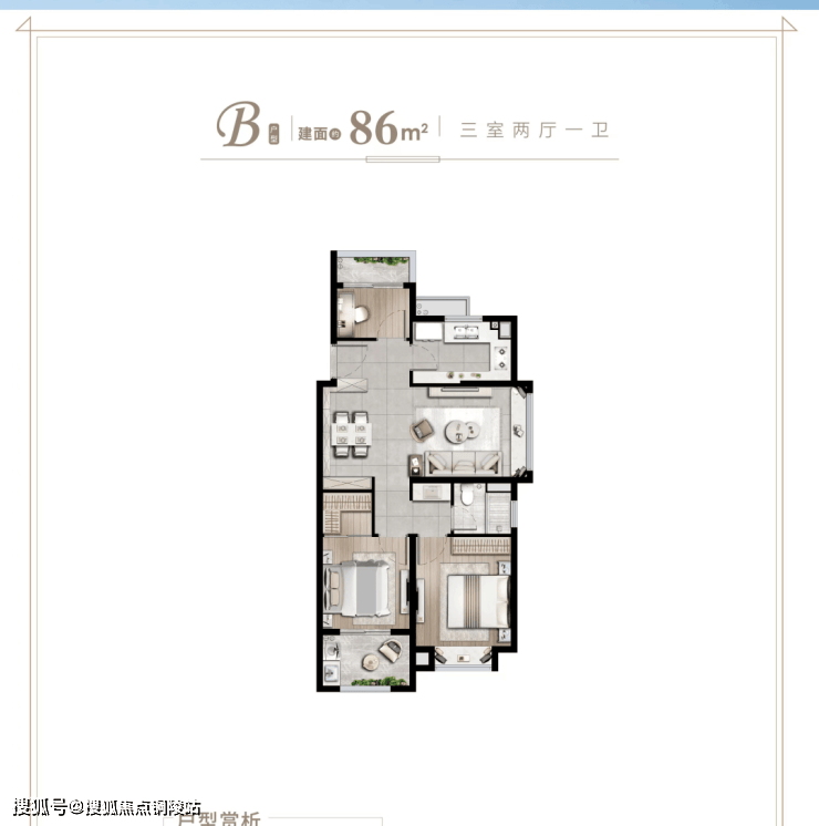 ①86平(三室两厅一卫) 边套户型,三面采光