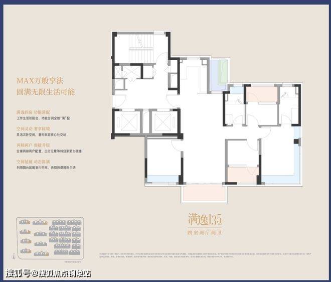 同样是两梯两户配置,四室布局均衡分配各功能空间尺度,通过多阳台设计强化室内外交互,为家庭聚会及日常起居提供更多场景可能。
