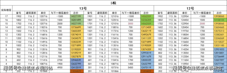 小高层119㎡户型中,单价最高的为12单元,主要原因在于这个单元与东边套139㎡户型拼接,得房率相对更高——在套内面积与13单元同户型相近的情况下,产权面积比13单元中间套小了近3㎡,因此单价略高。