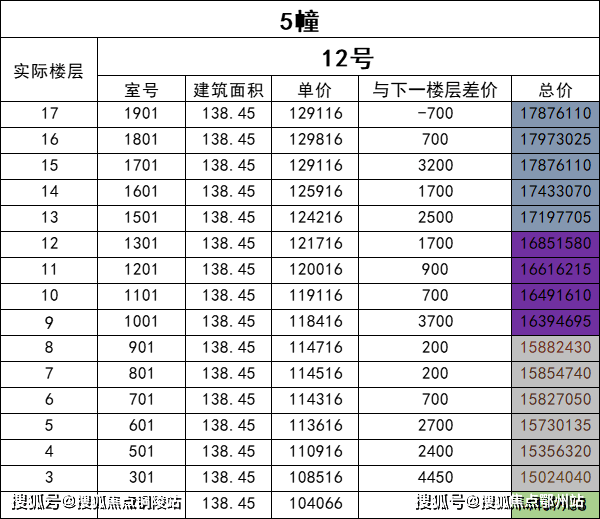 东边套139㎡户型的定价逻辑则有所不同,各楼层之间存在更为明显的价格差异。