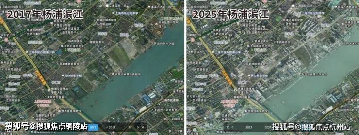作为黄浦江畔的压轴板块,杨浦滨江的建设速度是有目共睹的,下图是2017-2025-2026年杨浦滨江的卫星影像变化图,几乎是一年一个样!