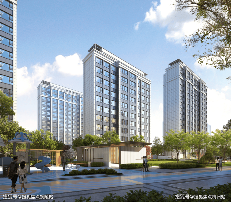 通过园林中曲径通幽的设计手法,布置景墙设计,引人入胜。社区内打造大树聚场、儿童乐园、阳光草坪、健身跑道等多个功能空间,依托架空层构建出更多的互动空间,扩展社区内的活力活动场域,为居者营造更多幸福生活的场景。