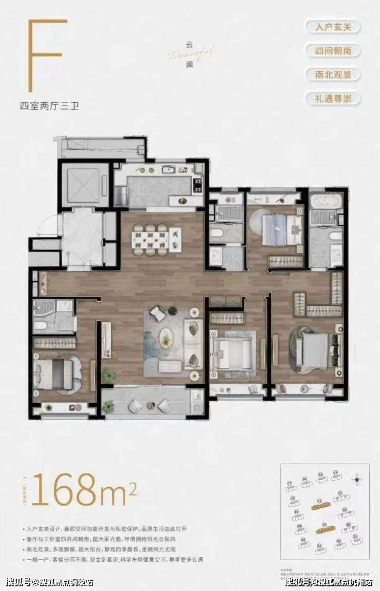 另外,四房户型双房朝北似乎是逃不开的问题,但陆家嘴锦绣云澜这个建面约168㎡的4房却做到了三间卧室全朝南,并且 南向双套房设计 。
