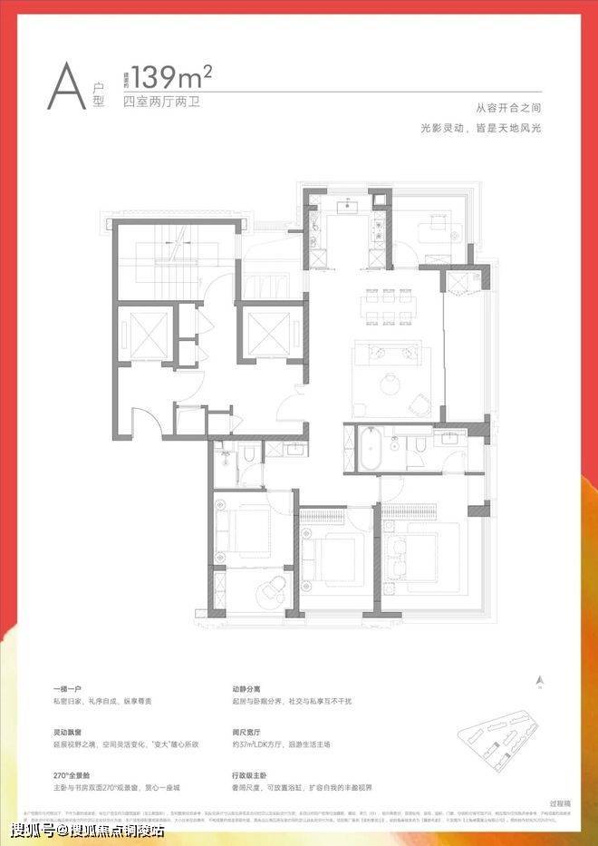 项目首推建面约117-139㎡3-4房,你想要的“类独立电梯厅”、“双阳台高实得率”、“大面宽”、“270°灵动飘窗”等应有尽有。