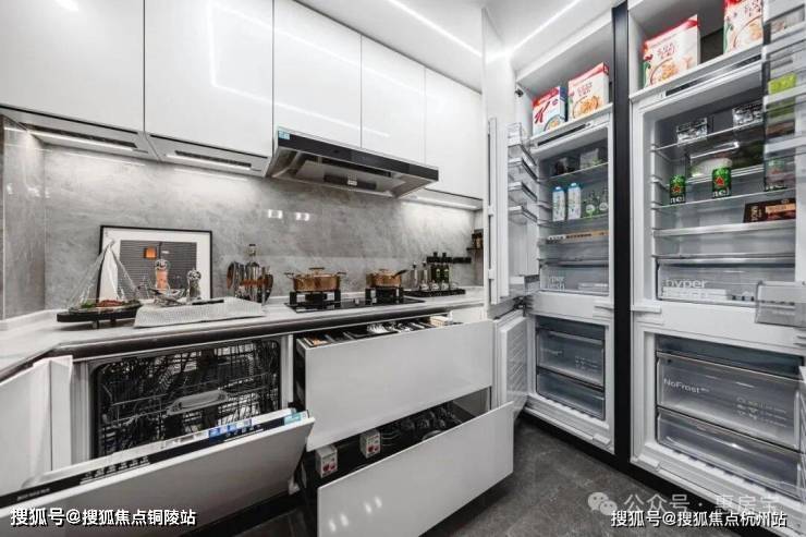 在户型的生活动线设计方面,象屿也极尽巧思,如在厨房采用 U型设计动线 ,让住户一个转身就完成洗、切、配、烧四个步骤,省时省力;同时配备 西门子品牌脱排、灶具、洗碗机三件套,以及嵌入式冰箱, 方便了居家生活……