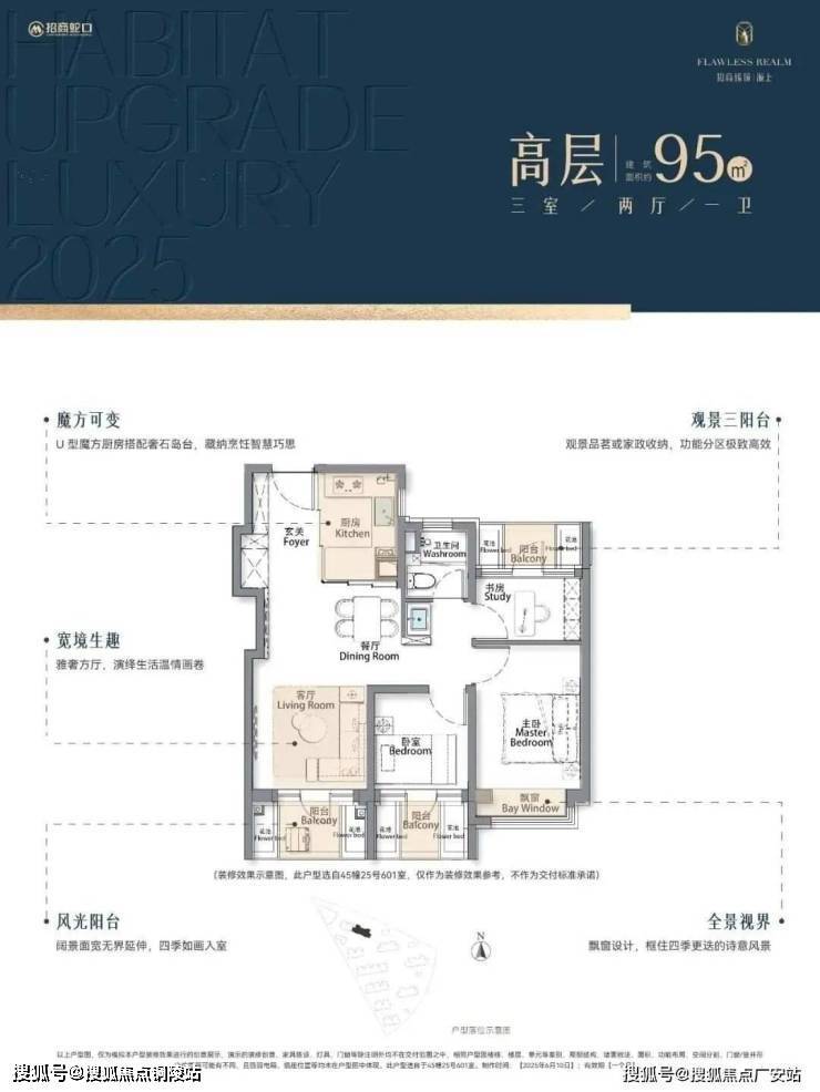 再加上南向大面宽短进深、全卧飘窗、L型转角阳台设计,哪怕小户型95㎡3房,尺度感都超棒,采光和视野更是一流。