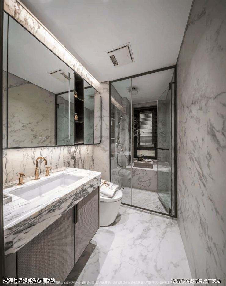 卫生间墙面采用大面积岩板,台盆柜处定制镀金龙头;另外超大镜面柜内配置了充电口,方便剃须刀、电动牙刷等工具收纳。