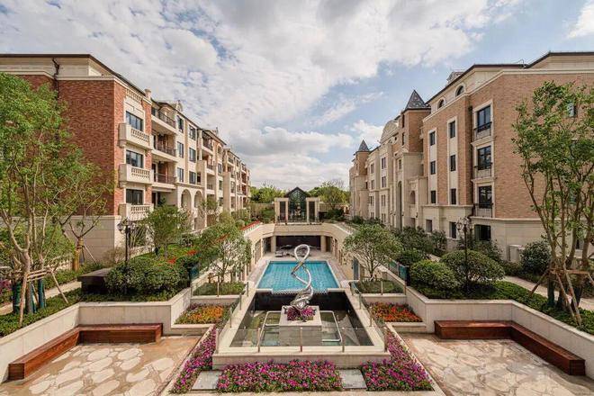 社区建筑采用欧式设计风格,外立面均为文化砖及黄金麻干挂石材打造,配备涉外别墅级草坪活动广场、下沉式露天泳池、喷泉广场,高成本打造精致又舒适的社区环境。景观则采用横纵对称设计,拥有完善的河岸景观及滨水步道。