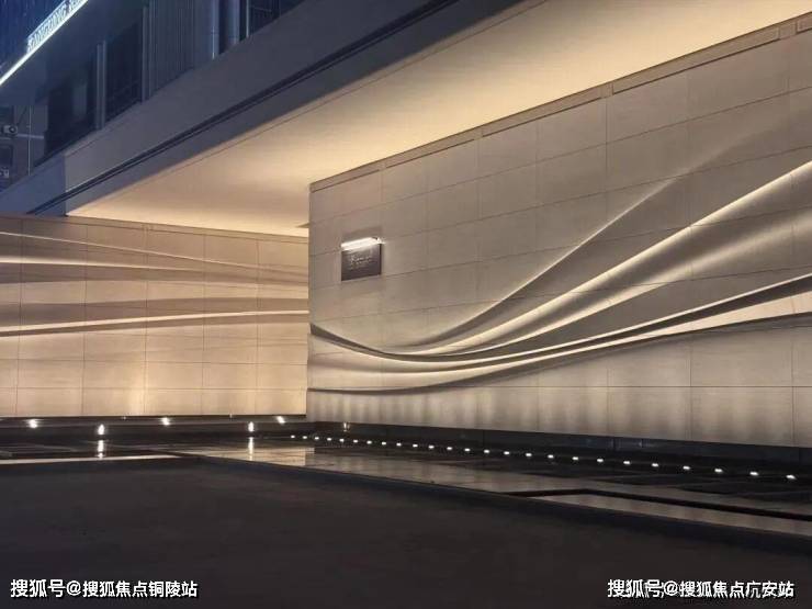 采用米黄色温润石材,巧妙模拟风的流畅形态,营造出既庄重又舒适的归家氛围。这片宽广的流线型石墙在柔和灯光的映衬下,更显璀璨夺目,而风雨连廊的灯带设计,更添一份尊贵仪式感。