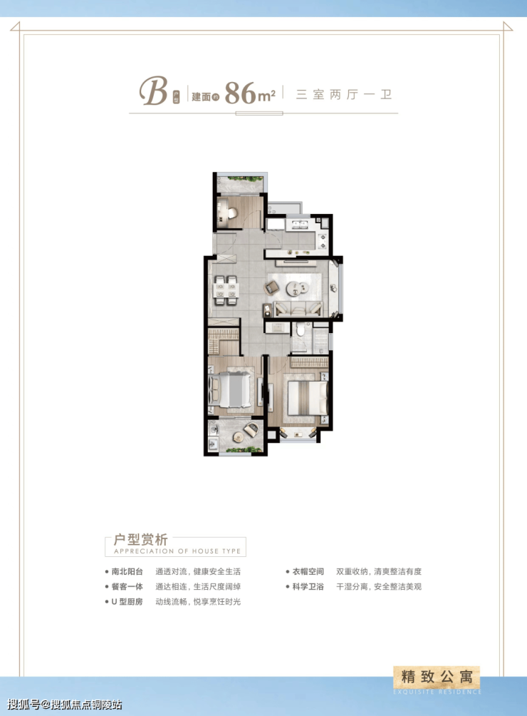 建面约86㎡3房2厅1卫户型特点:做到了双开间朝南+双阳台设计+卫生间干湿分离,一个非常紧凑的小3房户型。