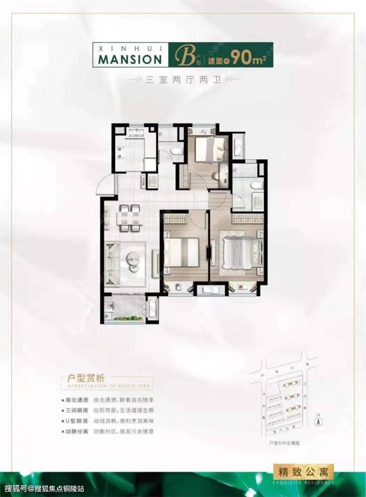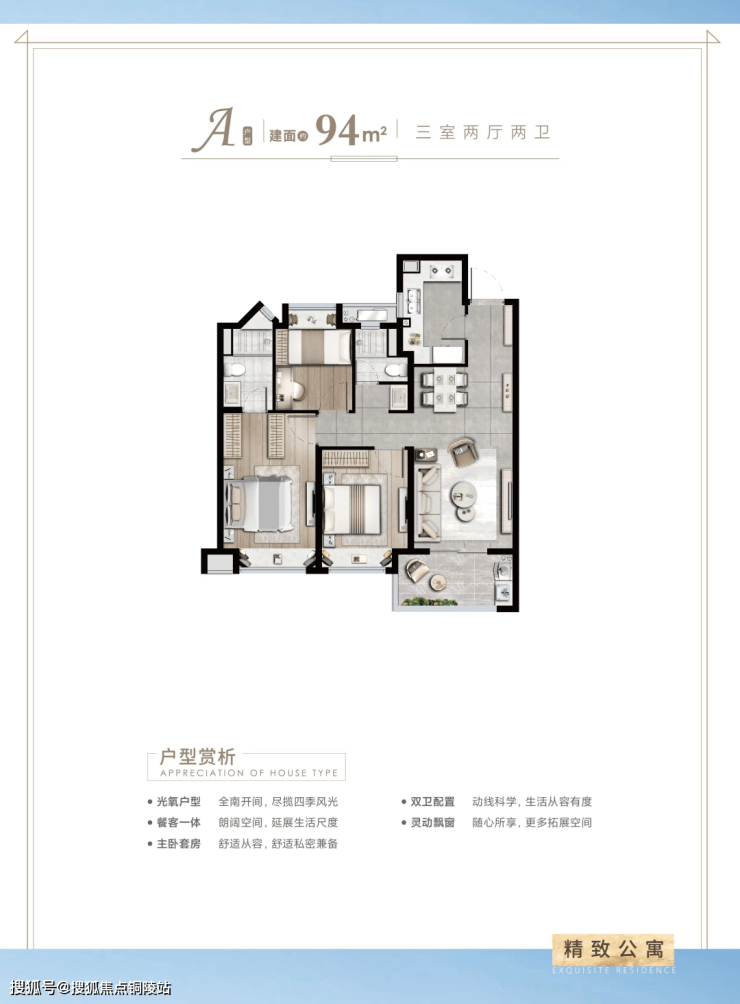 建面约94㎡3房2厅2卫户型特点:做到了三开间朝南+主卧套房设计+全卧飘窗+动静分离+卫生间干湿分离,功能性与空间感完美结合的3房“神户型”。