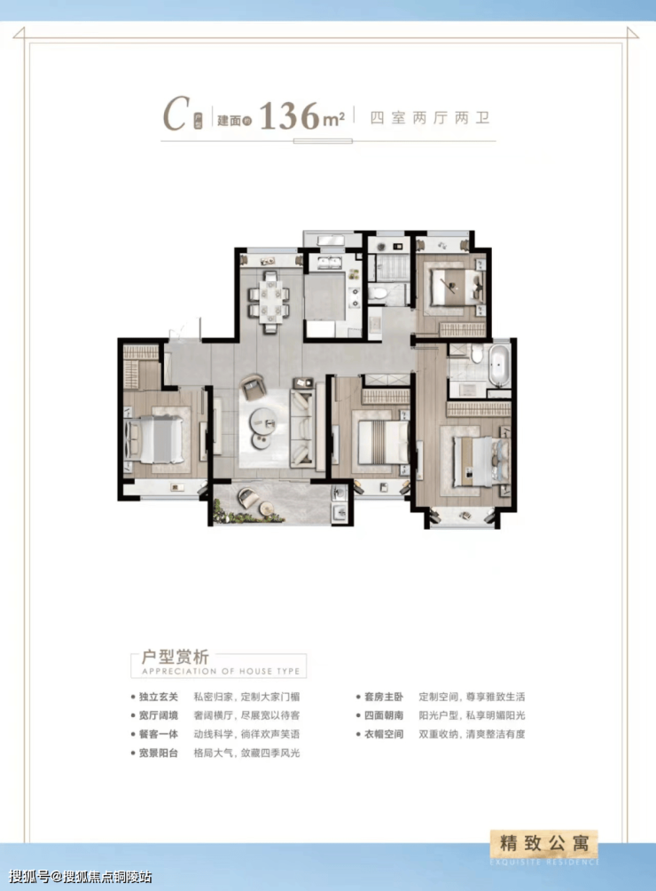 建面约136㎡4房2厅2卫户型特点:做到了四开间朝南+全卧飘窗+主卧套房设计+南北通透+客卫干湿分离,一步到位的改善型大4房。