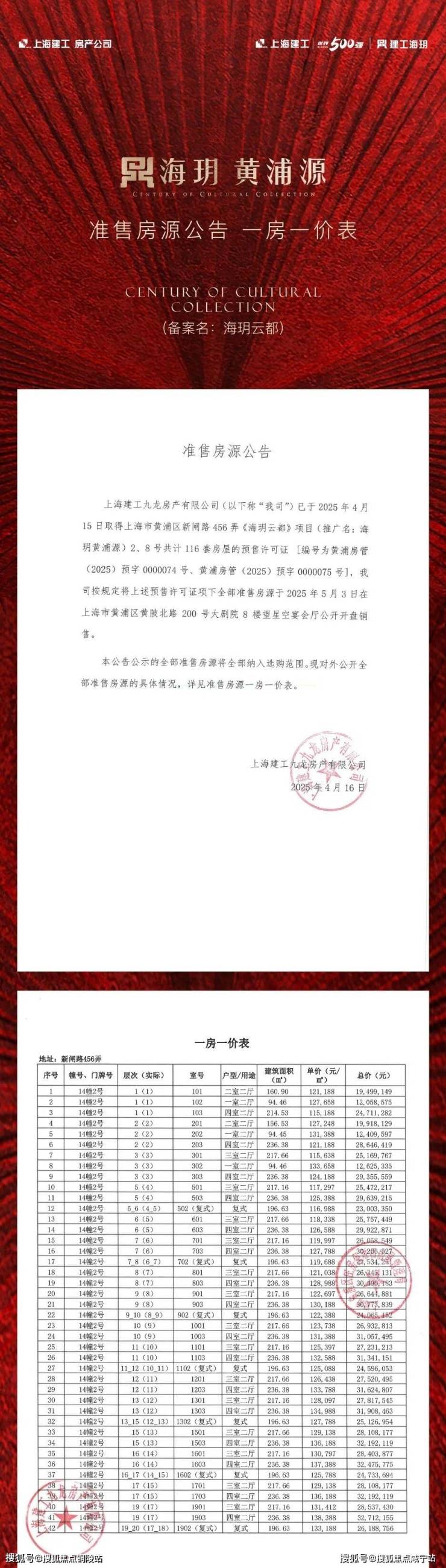 黄浦区「海玥黄浦源」少量建面约196-402㎡多种户型;均价14.56万/㎡!