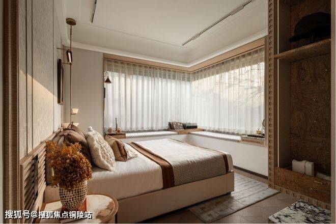 270°无柱飘窗的主卧套设计,打造出一座“空中观景舱”,将晨昏光影、四季流转尽数收纳,极大拓展了生活的视觉与心理边界,推窗即览美景,让居家时光更具诗意。