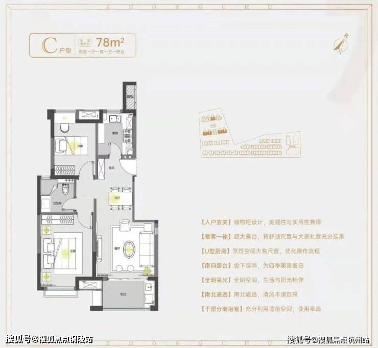 建面约78㎡2房1卫户型,做到了双开间朝南+南北通透+卧室带飘窗+动静分离,功能区划分、动线都非常清晰。