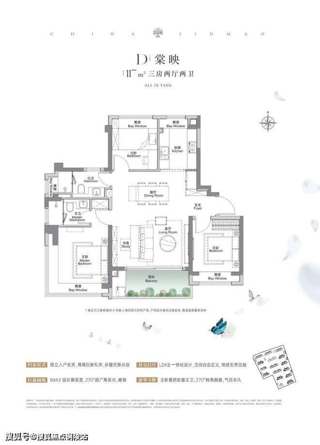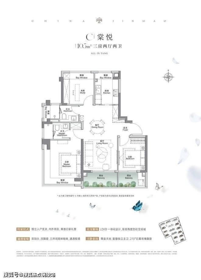 建面约105、117㎡3房2厅2卫,空间布局非常相似,都做到了三开间朝南+多个飘窗+主卧套房设计+270°转角飘窗。