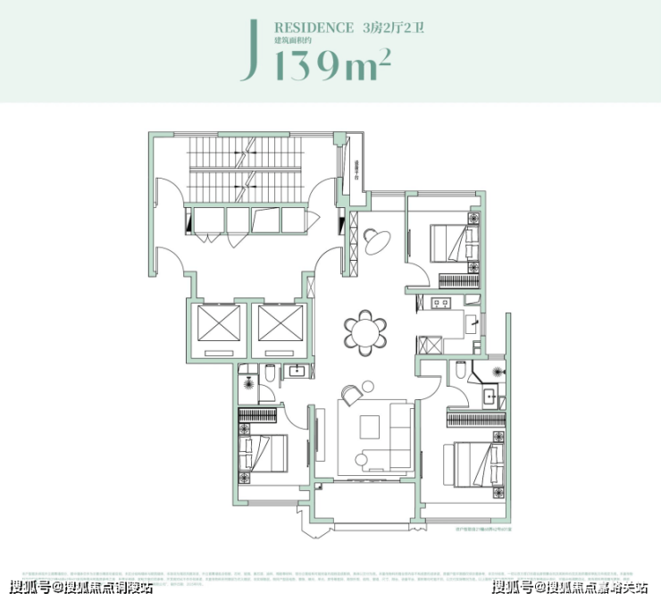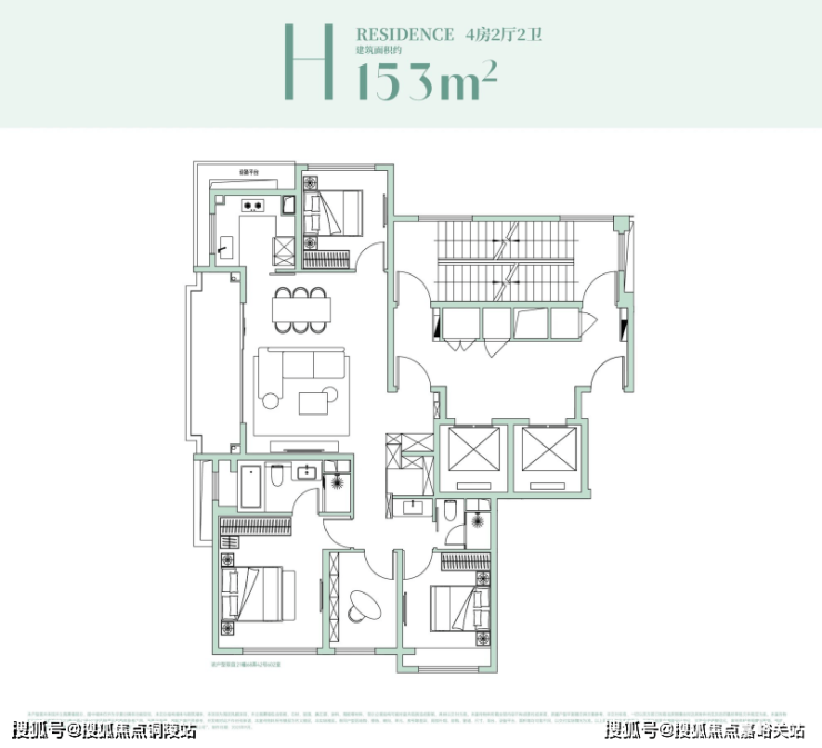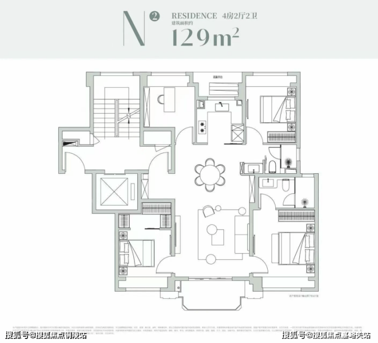 该户型是经典的四叶草布局,四开间分布在四角,兼顾私密与互动,是二胎家庭的优选;