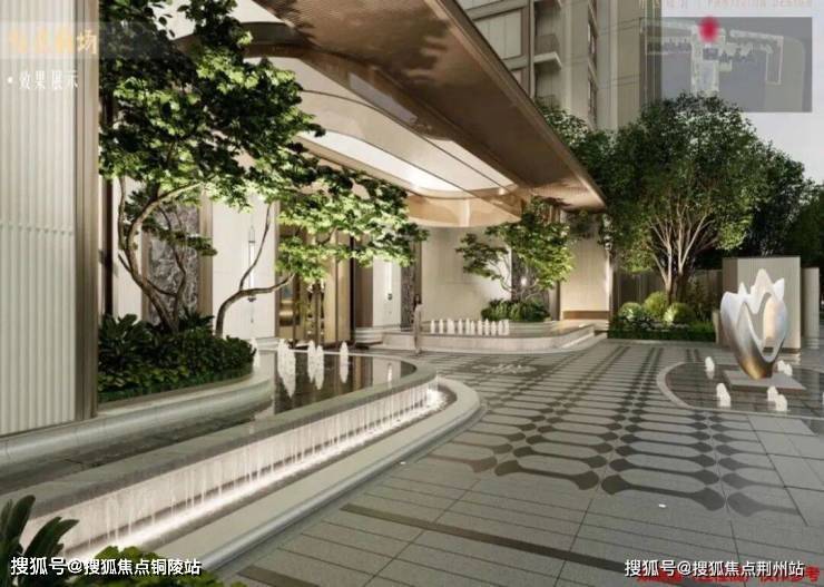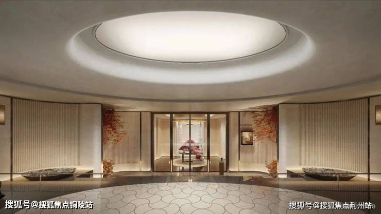社区大堂极具仪式感,未来会采用地下会所设计,入口采用三重弧形石材墙体+圆角幻彩穿孔顶,夜幕下如流淌的鎏金河流。