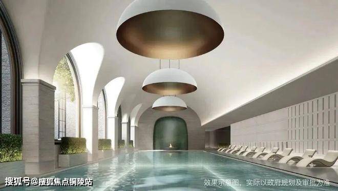 整个泳池天花板,呈现出海派拱形元素,落地玻璃窗外,是下沉式的景观空间: