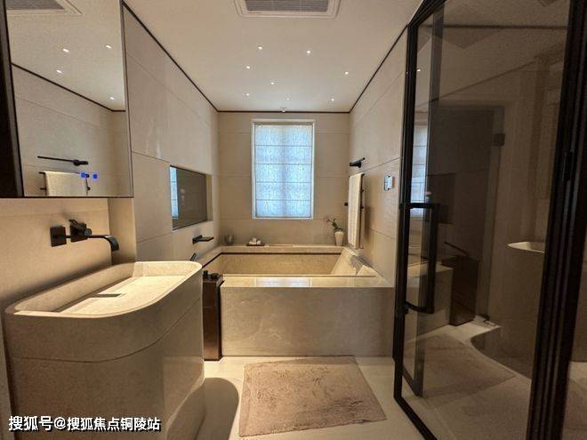 而样板间里这第二个卫浴空间,更接近于享受级。嵌入式浴缸,设计了魔镜系统,可以供业主泡澡时观影娱乐;除此之外,这个卫生间也有独立的淋浴房,并设计有桑拿房。