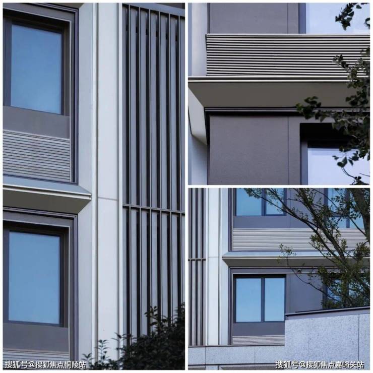 外立面设计以浅色香槟铝板线条、深色香槟铝板窗套搭配暖灰色真石漆,整体配色更具活力。