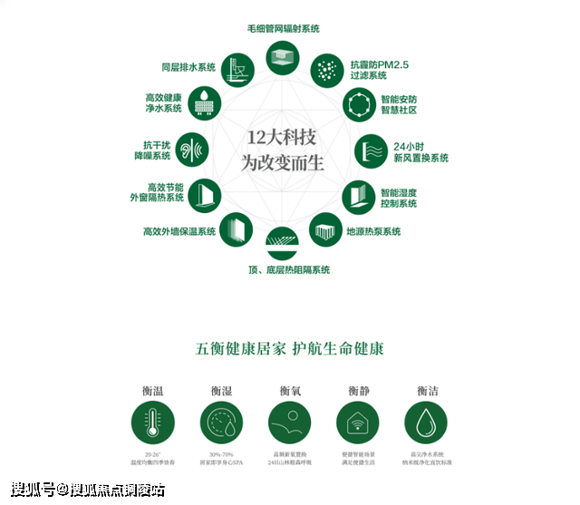 -十二大绿金科技+五衡系统:衡温(毛细管网辐射控温)、衡湿(湿度30%-70%)、衡氧(24小时新风净化)、衡洁(末端净水)、衡静(三重降噪)。