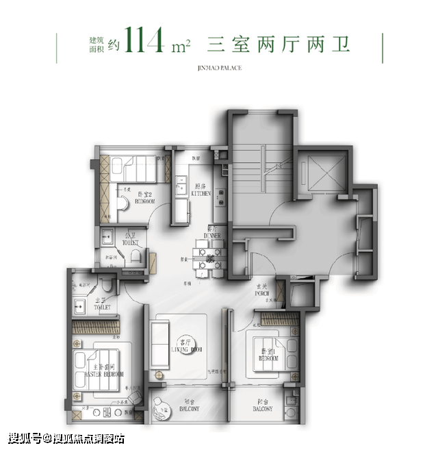 - 114㎡三房两卫(客厅与次卧联通阳台)