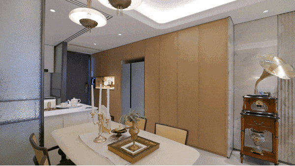 创意展示空间处处展现了海派风韵,例如更耗时更费钱的带弧度的半圆形吊顶!以及厨房的三轨道移门的水波纹玻璃,更具奢华腔调!