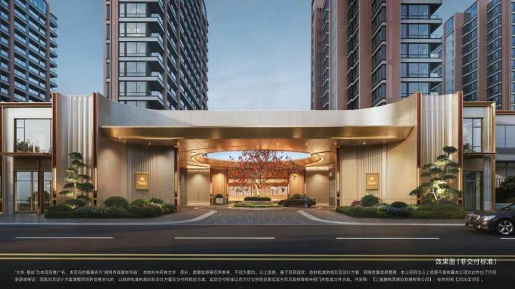 在选材上,项目采用米色石材、铝板和金属镶框进行多元混搭,重点刻画单元入口、入户大堂等细节,质感非常丰富。尤其艺术感的弧形镜面立面,与门前蜿蜒的水岸风光相呼应,让建筑仿佛拥有了呼吸感和浪漫的情绪。