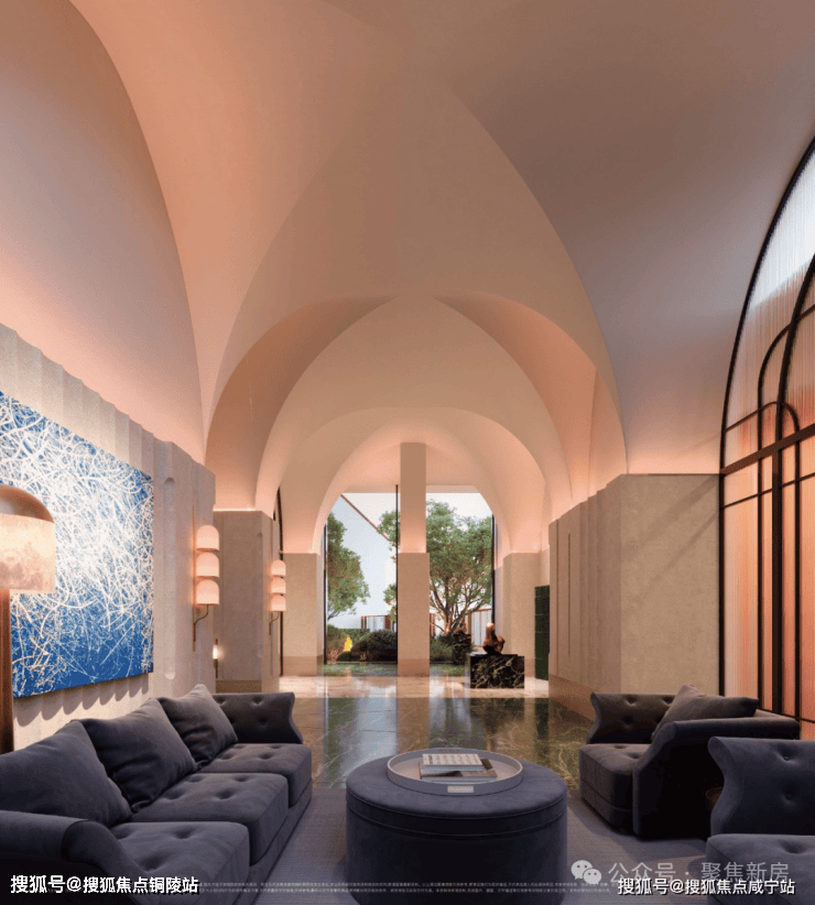 从九龙路起步,在繁花水岸的滨水步道上漫步归家;归家之路在滨水艺境另一侧,是约7000㎡的沉浸式邻里风貌街区,融合党群服务与邻里综合体业态,可在归家路途中感受精致烟火气;之后抵达九龙路归家主入口的河岸艺术大堂,两条地上细分动线,藏着不同的归家意趣:一条从主入口艺术大堂步入,沿着风雨连廊穿越花园小径,光影透过叶片洒落脚边,风携花香漫过肩头,仿佛逛完一场印象艺术展;另一条则经风雨连廊直抵“艺术品展列空间”泛会所,或许邂逅正在展出的私人藏品,在艺术氛围中完成圈层身份的过渡。最后步入电梯厅,半圆弧形天花吊顶暗合“天圆地方” 东方哲学,让归家终拾恢弘而宁静的仪式感。