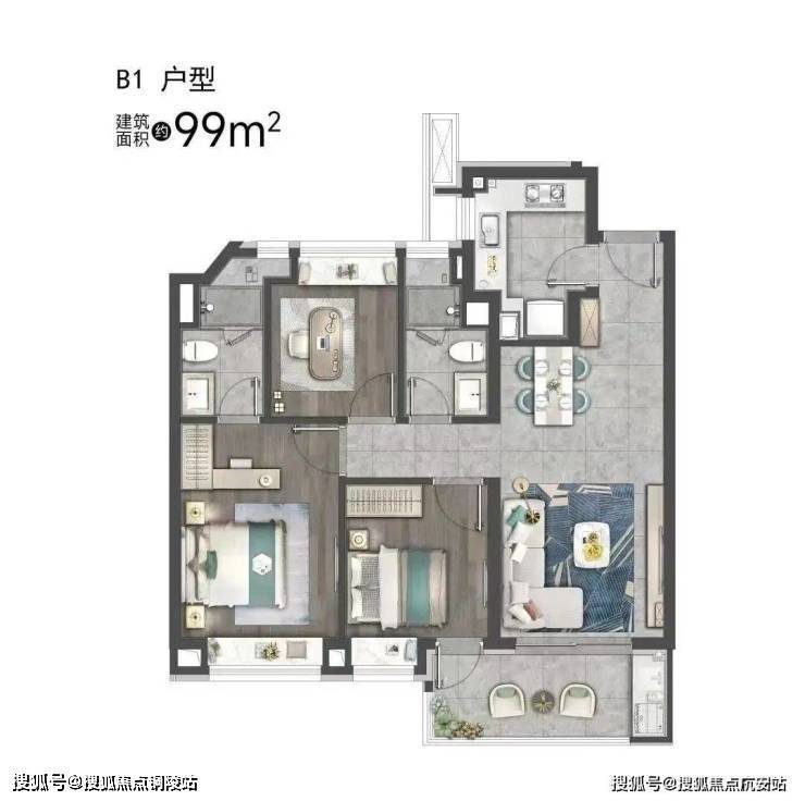 建面约105㎡为5.1米宽厅设计外接大阳台,这对黄金组合一方面撑开户内尺度,另一方面也让通风和采光俱佳。