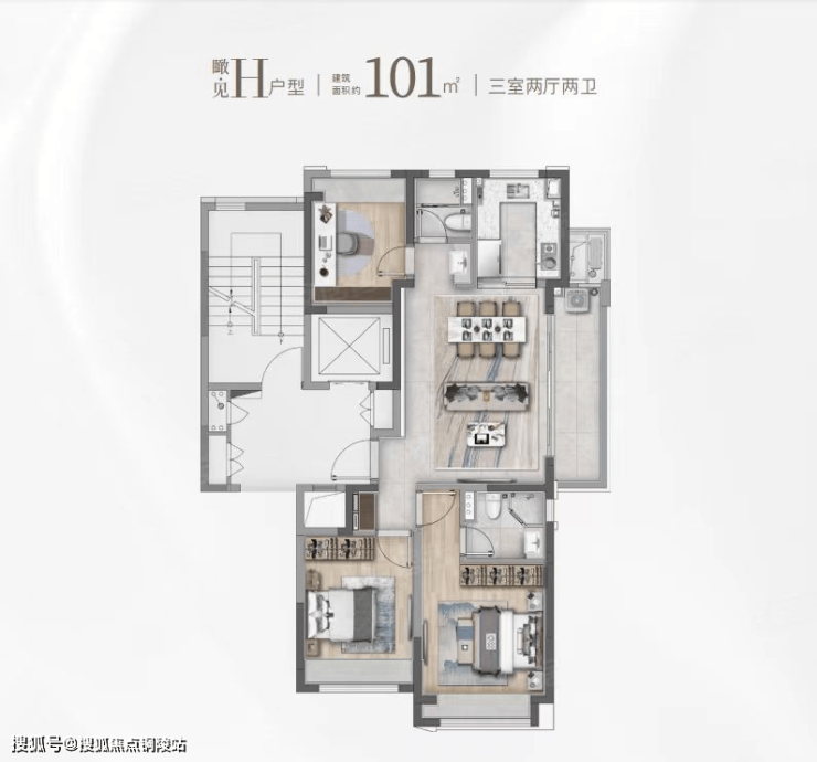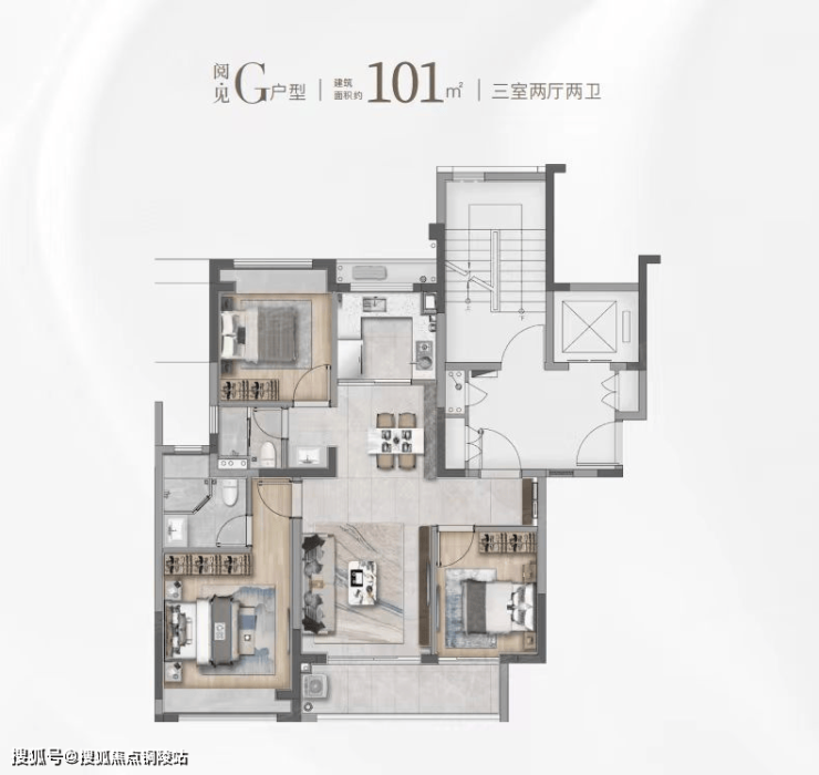 建面约101㎡的F和G户型都是市面上备受认可的飞机经典款户型。