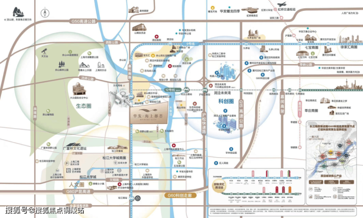 合心规划 产城样板:【“科创+人文+生态”城市单元示范】华发海上都荟首入松江,携崭新“优+产品体系5.0”,为洞泾、乃至为松江带来目前区域内综合高品质作品。结合上海生态环境保护“十四五“规划,站位国际领先的可持续性项目规划,华发海上都荟结合自身的独特聚合优势,在传统TOD规划之上,不可复制的土地生态资源,向东链接G60科创走廊“以镇命名为区块”洞泾人工智能产业基地;向南直达亚洲大学城之一——松江大学城;北侧紧连上海陆面自然山林资源——佘山国家旅游度假区。板块将区域打造成为“科创+文教+生态”交汇的核心新城模式,划立一个崭新的城市单元示范。