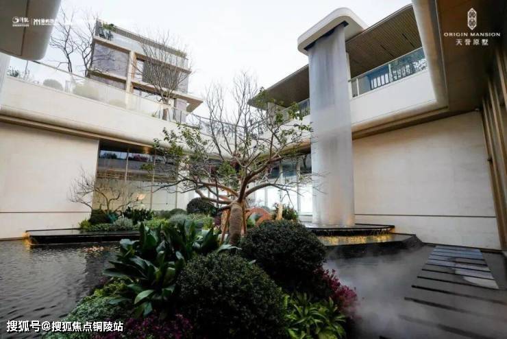 项目打造的下沉式庭院会所,是一个充满设计感的“精神私域”。它并非简单的健身房或会客厅,而是一个将功能与美学融为一体的艺术空间。约10米落差的金属挂帘流水瀑布,成为庭院中的视觉焦点,姿态优美的羽毛枫与黑金沙花岗岩树池相映成趣,让每一次步入都成为一场意境漫游。