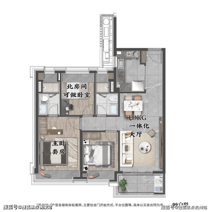 约99㎡ 3房2厅2卫:三开间朝南+双卫设计,主卧套房,是市场上的主流改善户型。