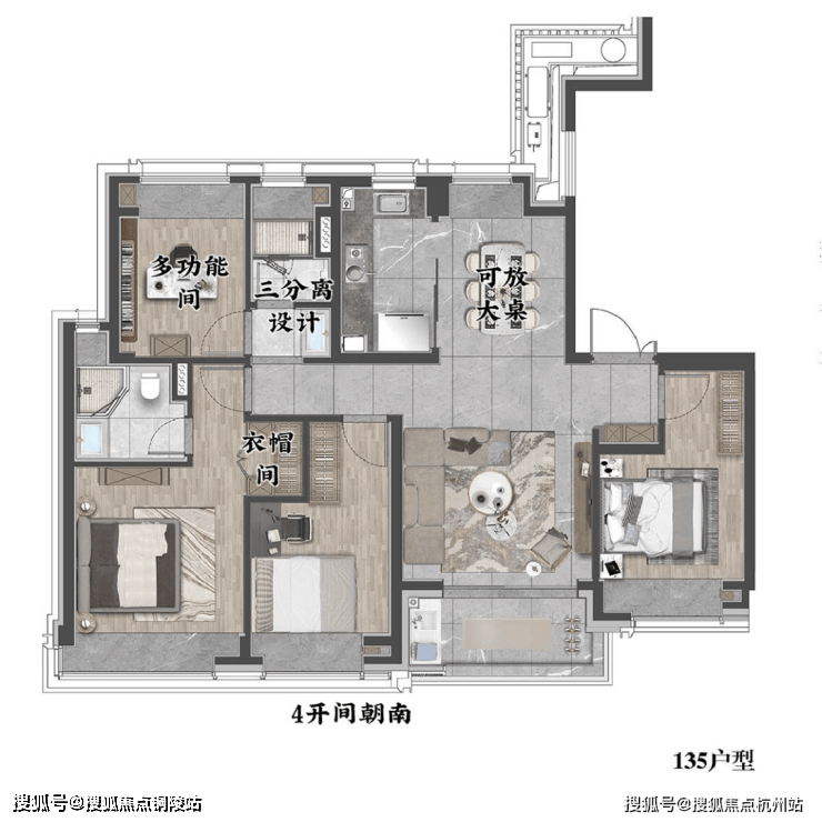 这一户型的功能性就更强了,更能满足多成员家庭的生活场景,南北正向通透的LDKG大厅宽敞明亮,就餐区放得下6人大桌,公卫采用三分离设计,使用功能翻倍,主卧套房打造了衣帽间,仪式感十足;4个房间可以根据业主需求打造多重功能。